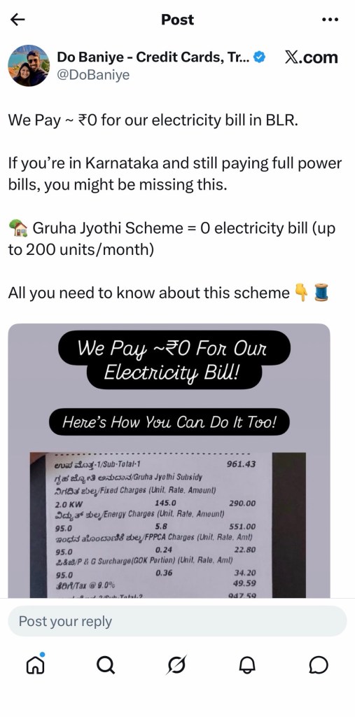 A recent social media post stopped me mid-scroll. A Bangalore resident, clearly comfortable enough to maintain a credit-card-and-travel lifestyle, proudly announced that their household now pays ₹0 for electricity. Thanks to Karnataka’s Gruha Jyothi Scheme, they receive free power up to 200 units a month. Rather than treating the subsidy as a quiet relief, they turned it into a public service announcement: “If you’re in Karnataka and still paying full bills, you might be missing this.”